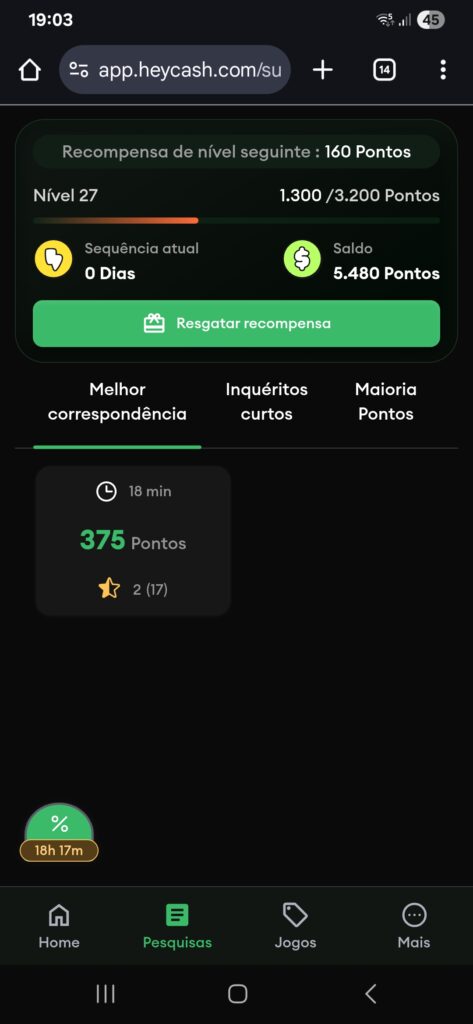 HeyCash é ideal para quem busca **ganhar dinheiro extra online**, com pagamentos rápidos e uma interface simples. Apesar da disponibilidade limitada de pesquisas e recompensas baixas, a plataforma é confiável e fácil de usar.