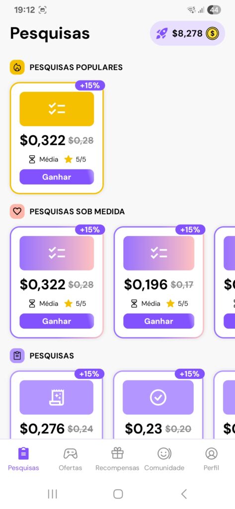 - Opcionalmente, complete pesquisas para aumentar seus ganhos.